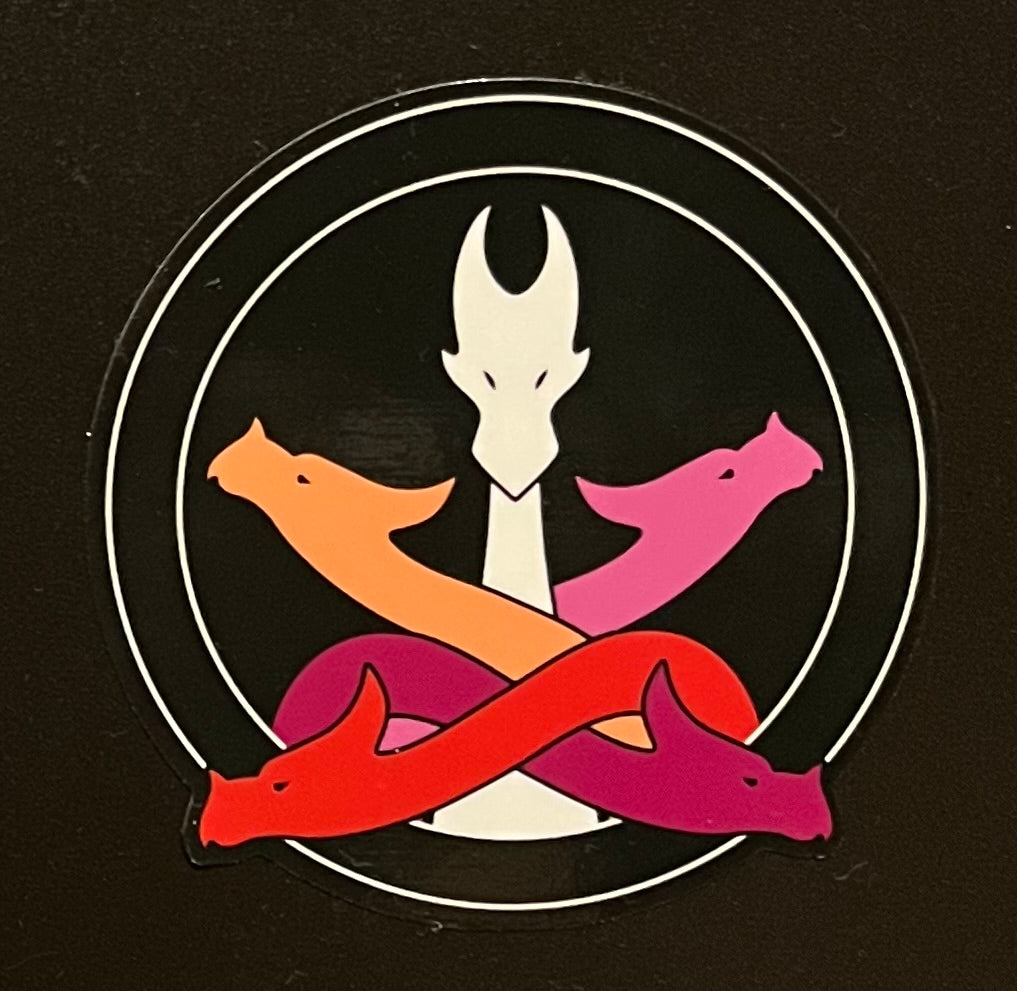 “Lesbian Hydra” depicts a five headed dragon in the colors of the lesbian pride flag.